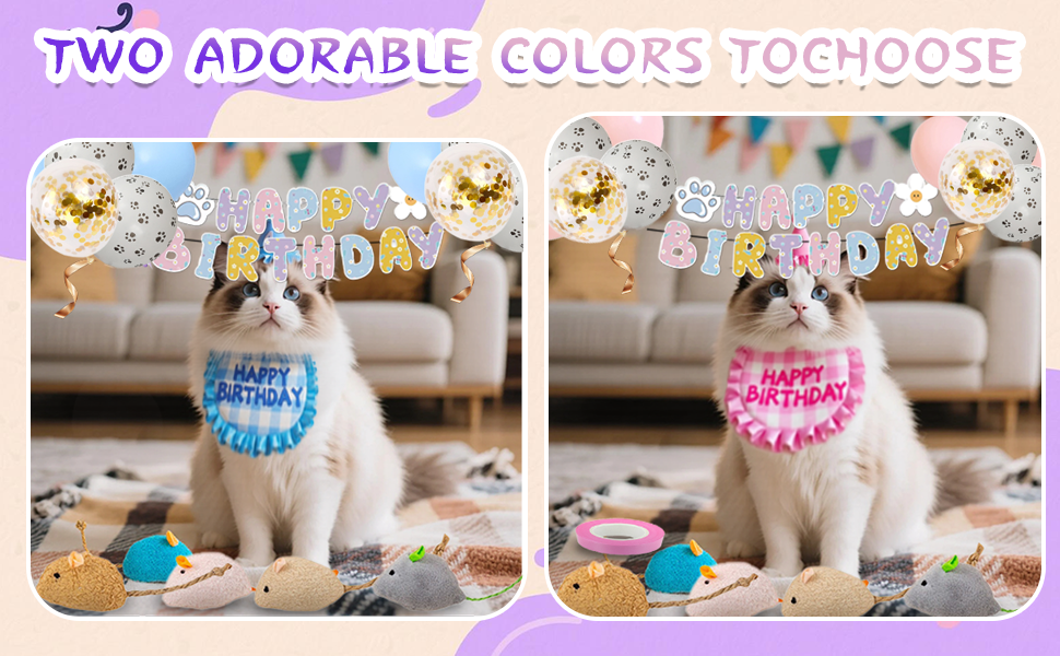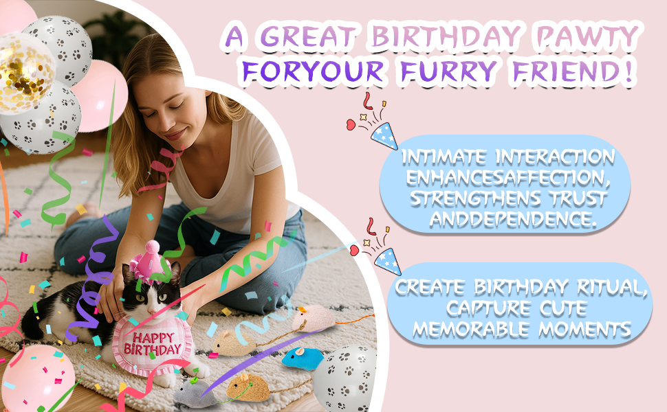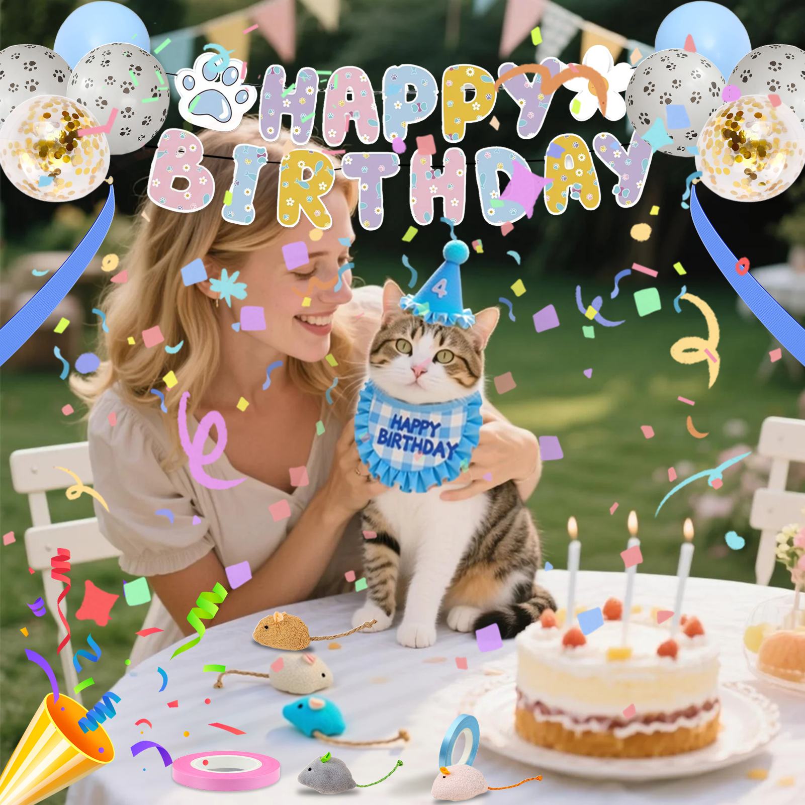 Cat Birthday Party Kit - Hat, Bandana, Catnip Mice, Balloons & Banner