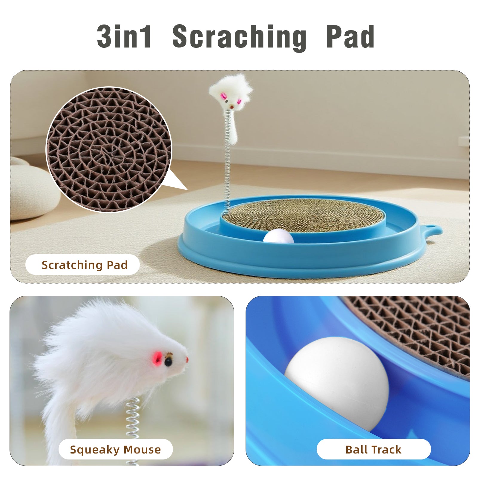 · 3-in-1 Enrichment Toy: This interactive cat toy combines a durable cat scratcher, a spring-loaded kitty toy, and a cat ball track, offering diverse play options. Perfect for scratching, chasing, or pouncing, it sparks your cat’s hunting instincts and keeps indoor cats engaged.