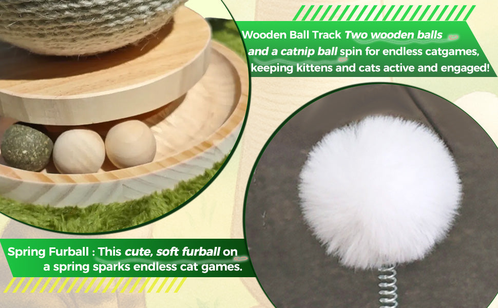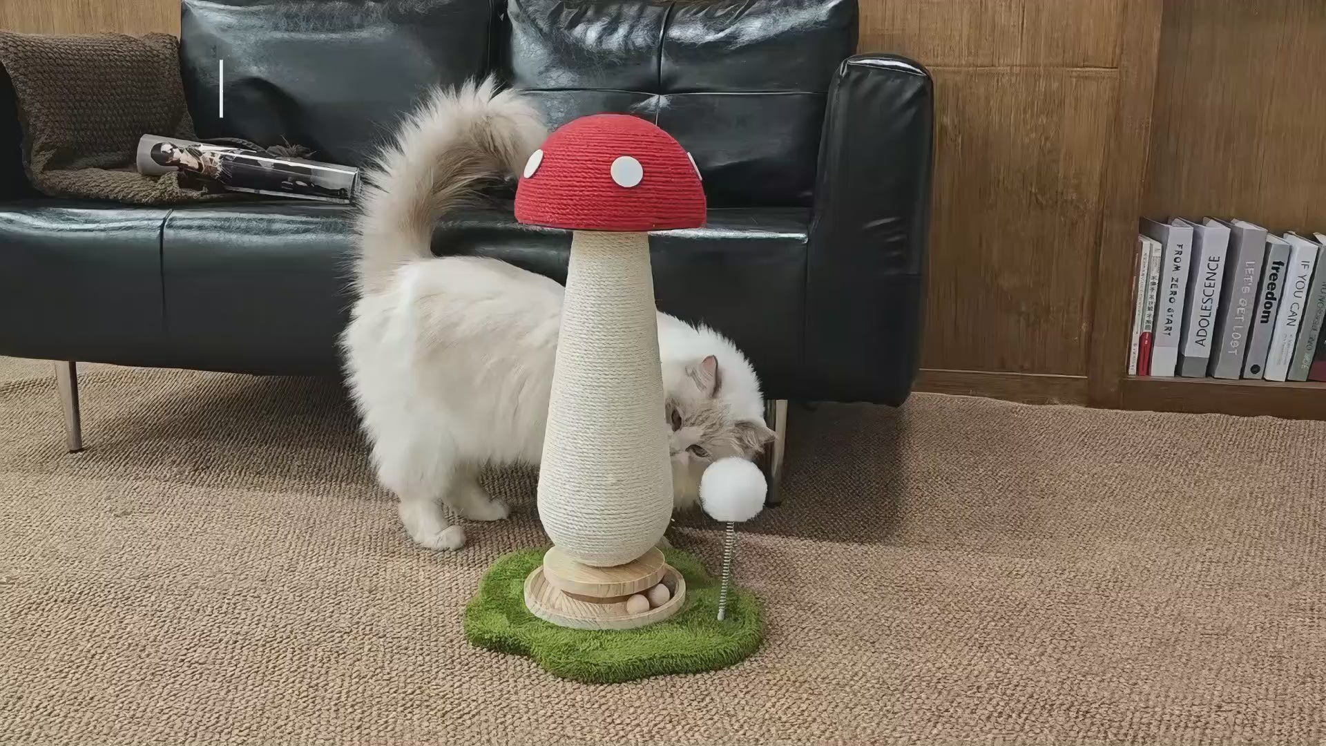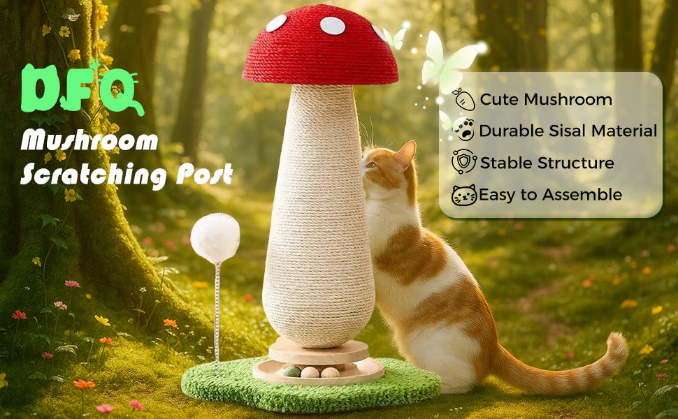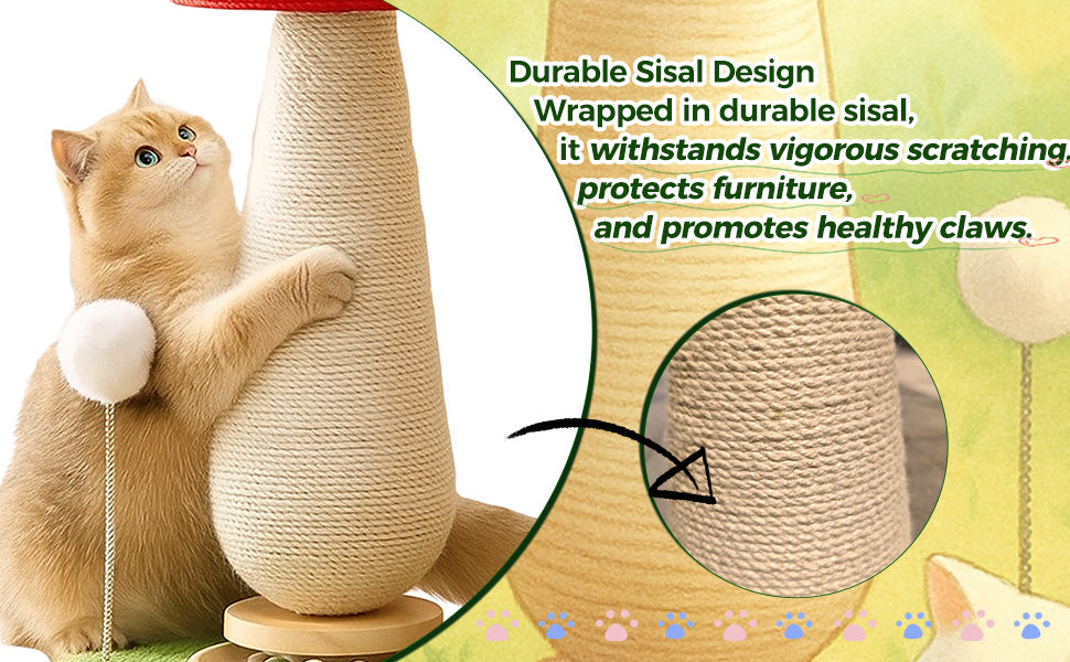 This tall mushroom scratcher is equipped with a rolling ball and bouncy spring toy, ensuring entertainment for your cat and protection for your couch.
